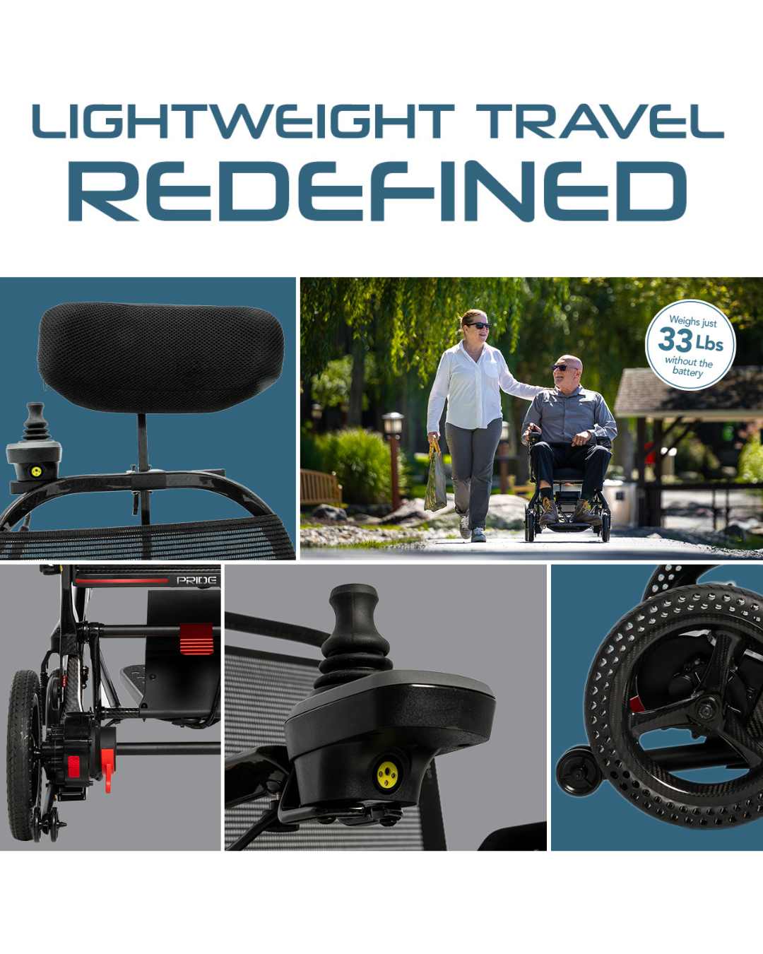 Thanks to an all-carbon fiber frame and a lithium battery, it’s durable enough to power you through airport terminals, yet light enough for convenient storage in car trunks. In fact, this power wheelchair weighs a remarkable 33 pounds – it’s our lightest Jazzy yet!